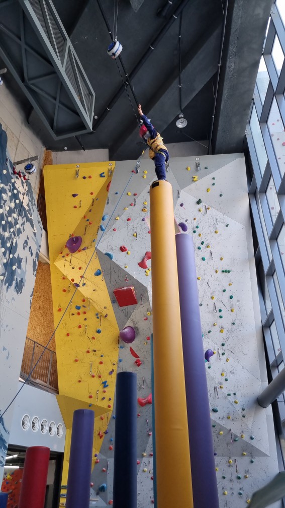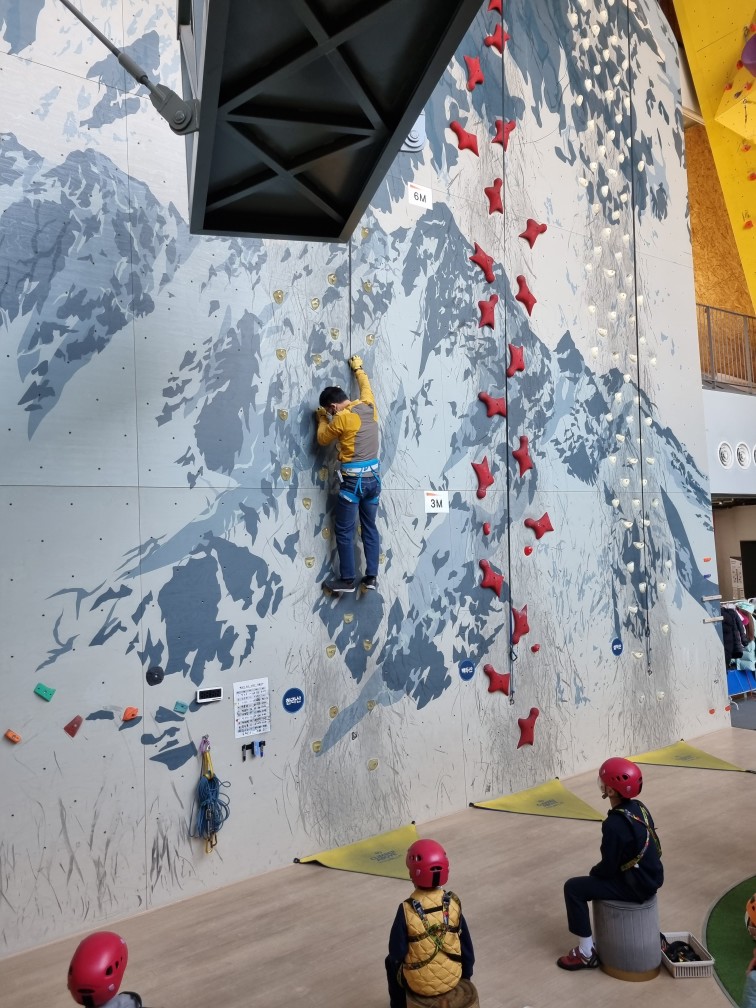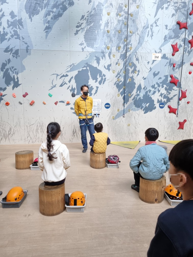여기서 대기 시간이 발행합니다. 사람이 몰린 코스가 생기면 다른 코스는 비운채로 한 코스를 계속 기다리게 됩니다. 많은 사람들이 중간 난이도인 한라산을 선택해서 동시에 여러 명이 클라이밍을 하지 못하고 한 사람만 오르고 내리는걸 모두 기다려야 했습니다. 그래도 강사님께서 융통성 있게 중간중간 코스가 비어있으면 다시 해보고 싶은 사람에게 또 기회를 주기도 했습니다. 그리고 아이가 얼마 못 올라가 내려오면 다시 한번 할 수 있도록 격려하고 시도하도록 해주셨습니다. 남편은 종 치기 직전에 떨어졌는데 팔과 다리에도 자극이 되고 힘들었다고 합니다. 무엇보다 위를 쳐다보며 하기 때문에 괜히 키 크는데도 좋을 것 같다고 합니다.